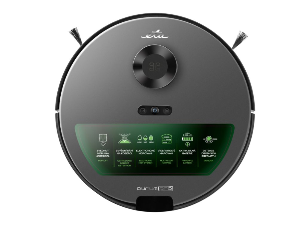 Robotický vysavač ETA Aurum PRO 6241 90000. S robotickým vysavačem ETA Aurum PRO můžete hodit úklid za hlavu. Díky laserové navigaci Laser+ 7.0 s ToF senzorem pro přesnější orientaci v prostoru je dokonale doma. Digitální motor a automatické zvýšení výkonu na maximum při najetí na koberec zajistí důkladné vysávání. ETA Aurum PRO dokonce vyprazdňuje prach a nečistoty do sběrného sáčku v dokovací stanici, takže na vysávání můžete zapomenout až na několik týdnů!